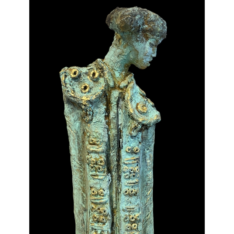 With this sculpture, Béatrice Fernando pays tribute to the iconic figure of the torero, reimagining it through a contemporary lens. The face, shown in close-up, exudes a serene yet haunting calmness, contrasting with the rigid and imposing posture of the body. This contrast between stillness and implied action is one of the work’s defining strengths. The details of the torero’s outfit are meticulously crafted, particularly the golden adornments that illuminate the rough cement surface, creating a subtle interplay between shadow and light.