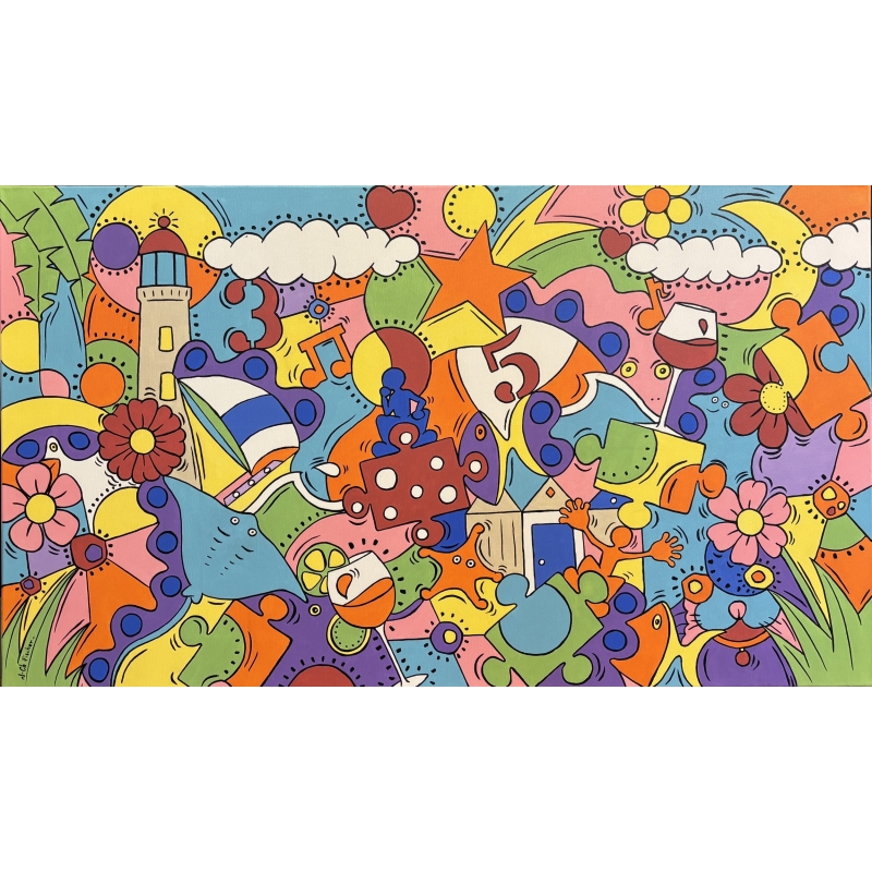 The composition unfolds as a visual symphony: flowers, musical notes, a sailboat, a lighthouse, stars, and puzzle pieces intertwine in an exuberant dance of forms and colors.