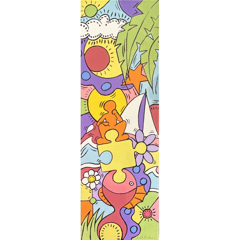 At first glance, the viewer is drawn to the clarity of the composition: a meditative figure sits atop a yellow puzzle piece, poised between the marine and celestial worlds.