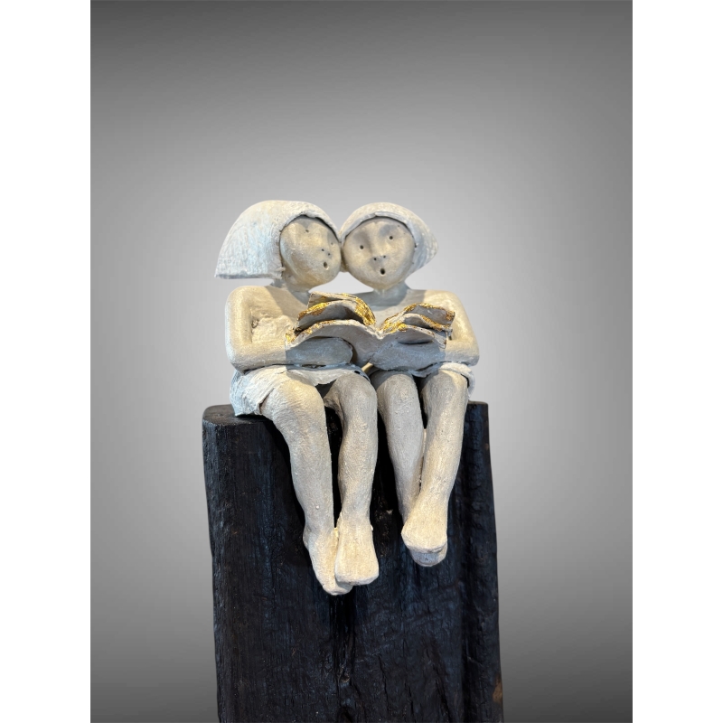 The two characters, delicately modelled, appear fully absorbed in their shared reading. The book’s pages, highlighted with touches of gold, bring a gentle glow to the composition. Their heads leaning toward one another create a palpable, intimate bond. Every detail—dangling legs, hands resting lightly on the book, torsos leaning closer—conveys a quiet complicity. Fourmy explores here the power of shared attention, that form of presence requiring no words.