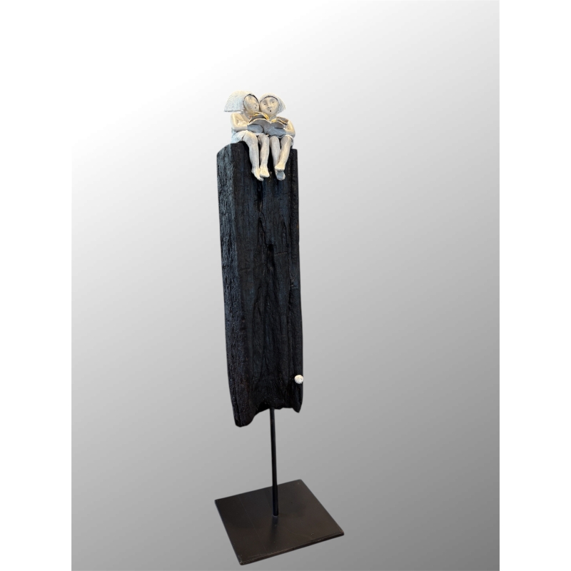Mounted on a discreet metal base, the sculpture gives the impression of floating, like a poetic column emerging from silence. The viewer’s gaze naturally follows the vertical momentum of the wood up toward the figures—a path inward, toward contemplation. Quand le monde se tait evokes that rare moment when everything seems to pause, when one retreats into the essential, when the presence of another becomes a sanctuary.
