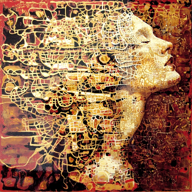 The composition unfolds around a female face turned toward the light, eyes closed, as if carried by an invisible breath. The features dissolve into a complex web of golden lines—labyrinthine structures suggesting movement, energy, and an opening toward infinity.