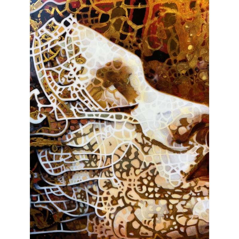 The use of gold powder and bronze powder grants Étrave a unique luminous intensity. Far from being mere ornament, gold becomes a living, vibrant material, capturing and reflecting light. This radiance transforms the work into a true contemporary icon, where the modernity of gesture meets the solemnity of traditional techniques.