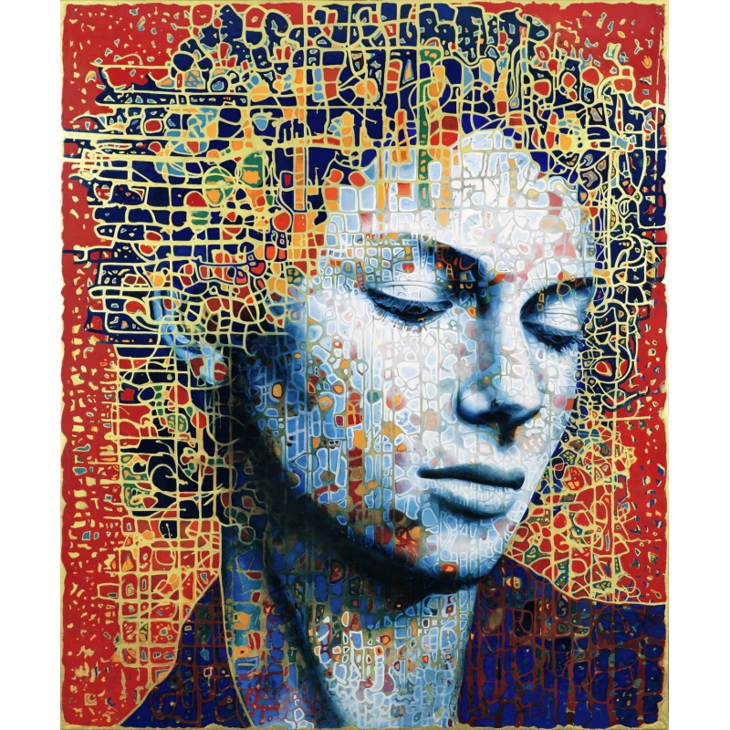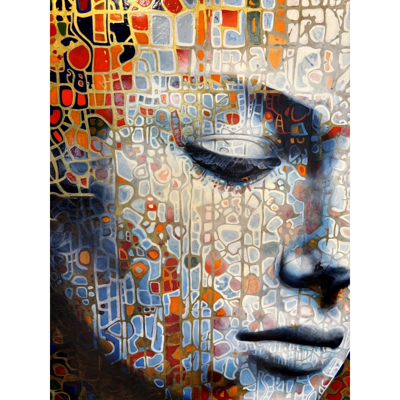 The androgynous face, eyes closed, unfolds in an atmosphere of inner silence. The features, sculpted by shades of blue and golden highlights, invite contemplation. The peaceful, almost meditative expression contrasts with the density of the graphic network covering the surface, interlacing colors and metallic accents.