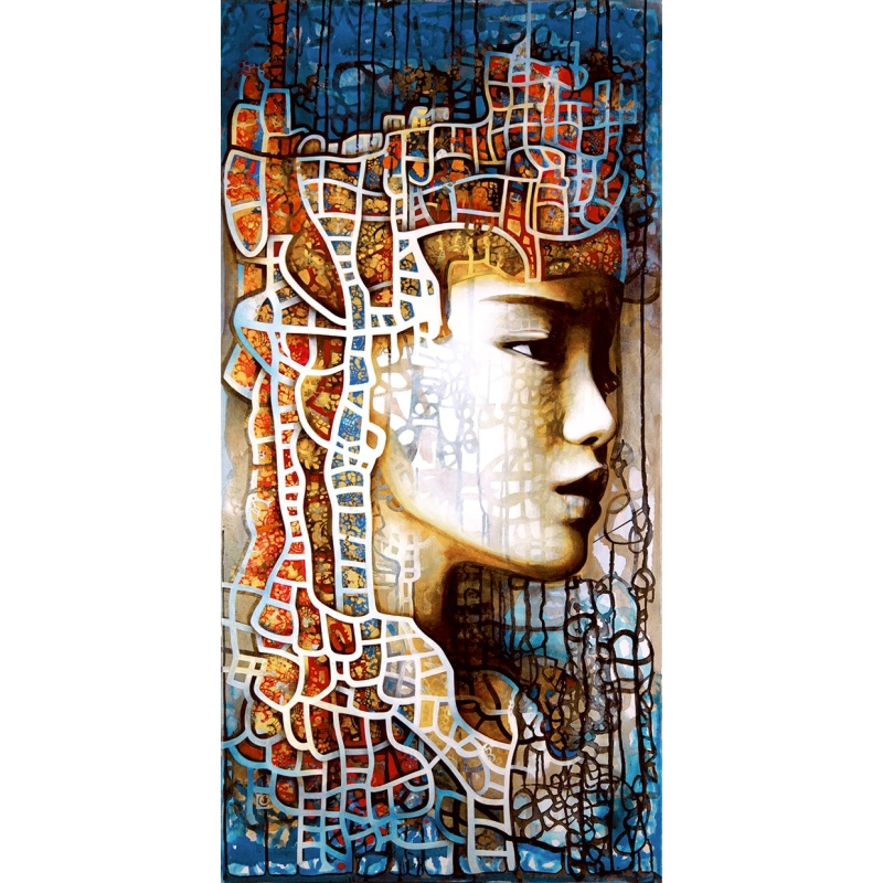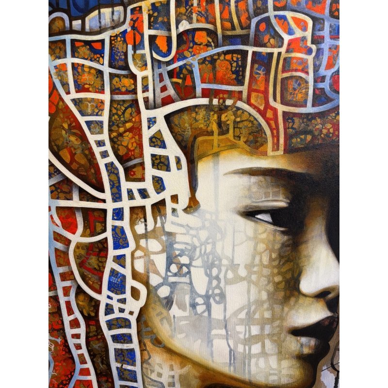 The face, inspired by Asia and portrayed in profile, occupies the height of the canvas with serene and majestic presence. Delicate features, highlighted by interplay of light and shadow, emerge from a network of colorful motifs and lines. The viewer is invited to contemplate this figure as one contemplates an icon—between mystery and revelation.