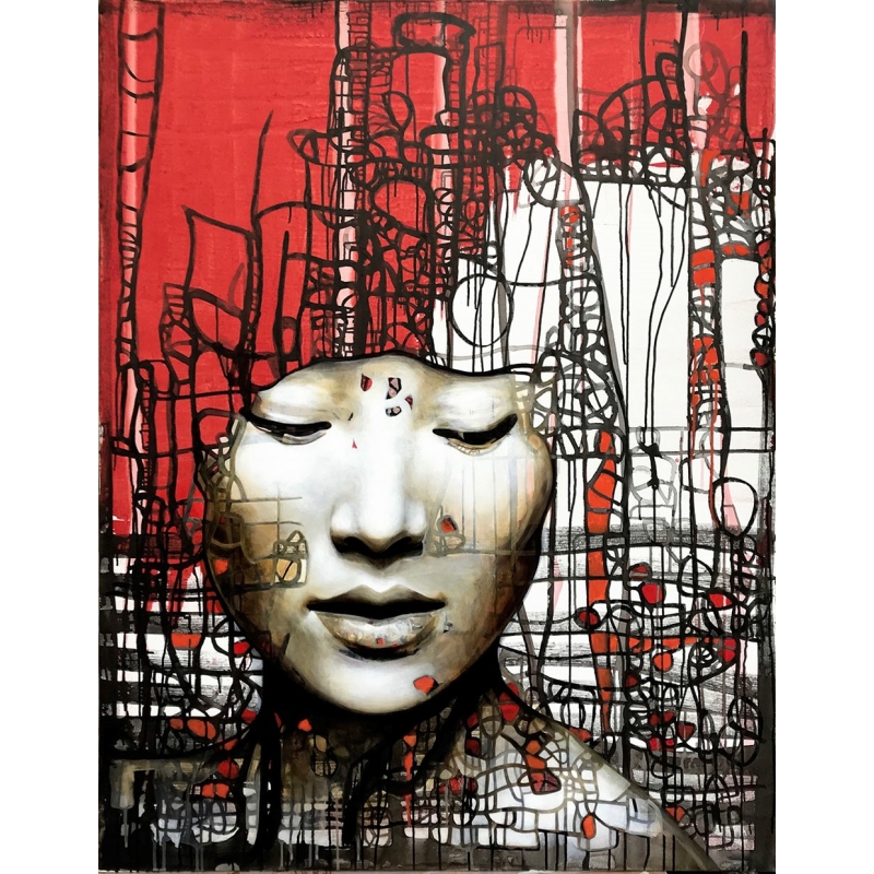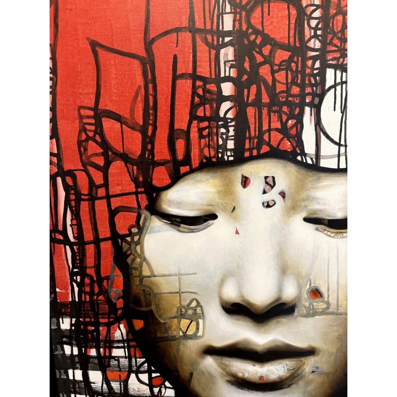 The portrait, inspired by Asian features, occupies the full height of the canvas. Closed eyes suggest meditative interiority, while the serene expression is traversed by networks of black and red lines that connect the figure to its surroundings. This constant dialogue between figuration and abstraction gives the work rare intensity.