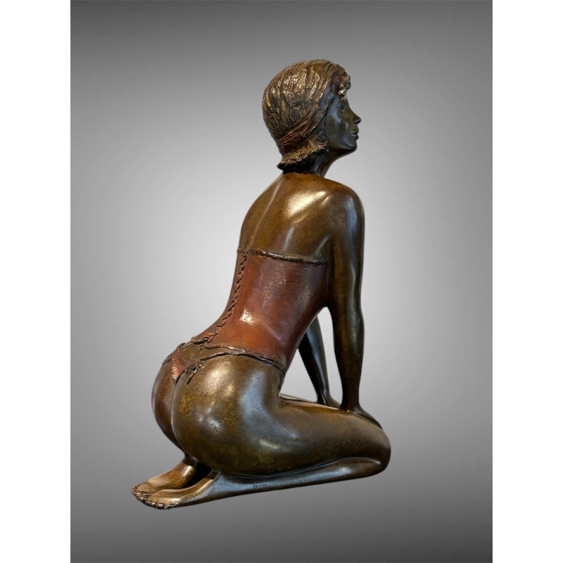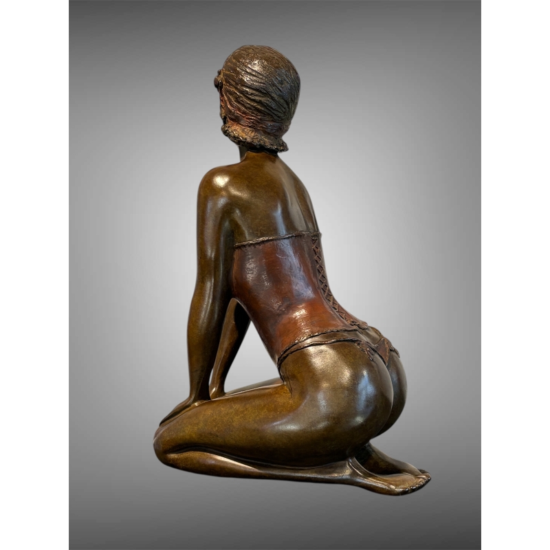 The bronze sculpture "Dessous Chics", created by the artist Mirogi, stands as a refined and expressive work where feminine sensuality meets a masterful contemporary sculptural language. This striking piece, depicting a kneeling woman in a posture that is both open and restrained, embodies a subtle vision of the female form—balancing suggestion, presence, and emotional depth.
