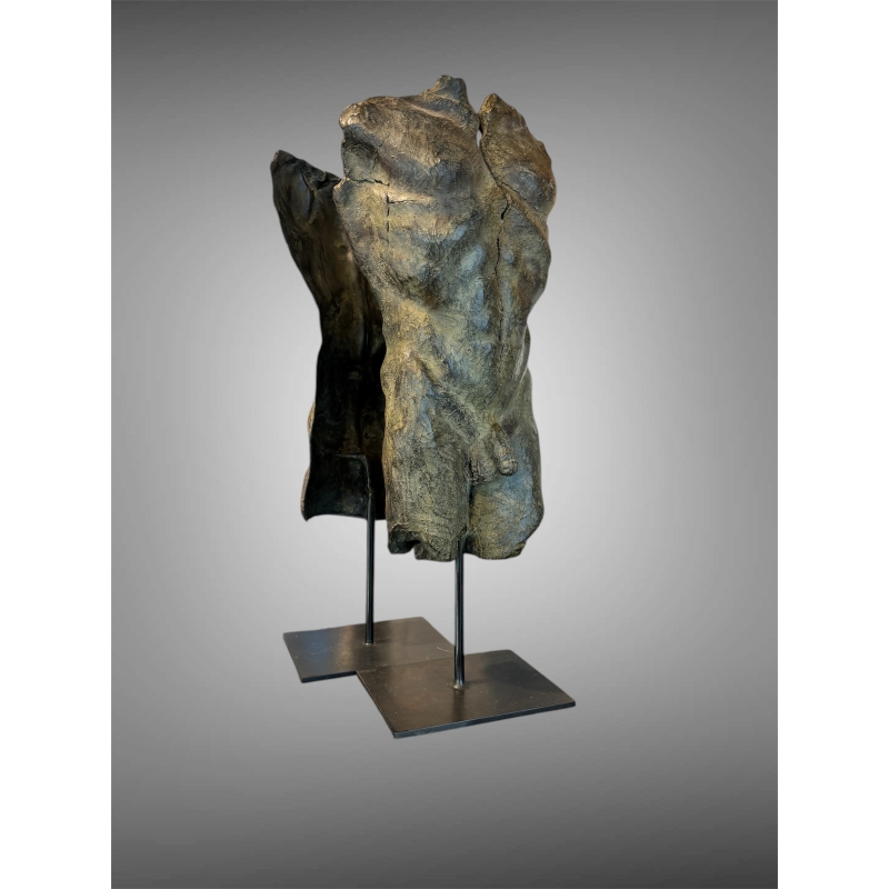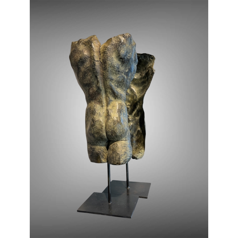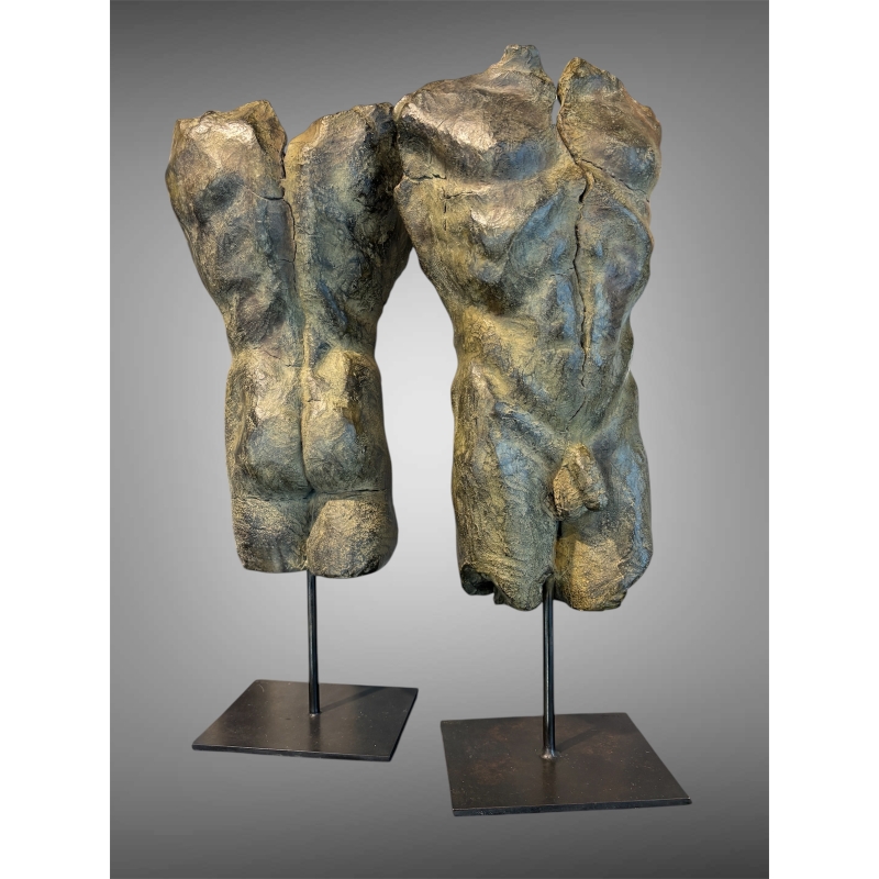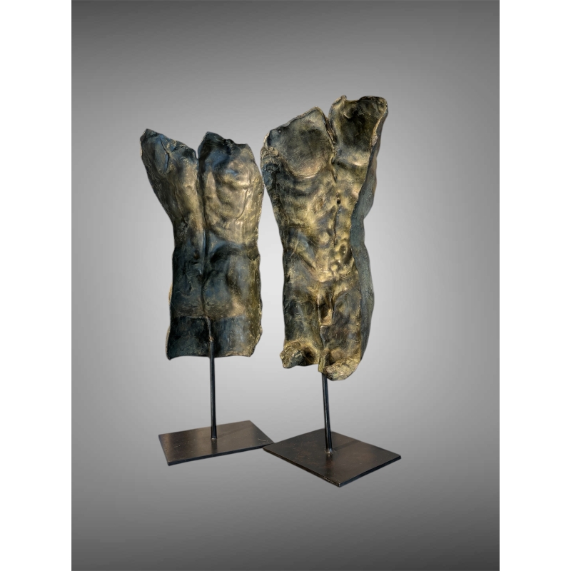 The bronze sculpture "Vice et vers ça", created by the artist Mirogi, offers a striking exploration of the male body through deliberate fragmentation and expressive form. Composed of two distinct parts of a single male torso, this work transcends simple anatomical representation to become a profound reflection on identity, perception, and inner duality.