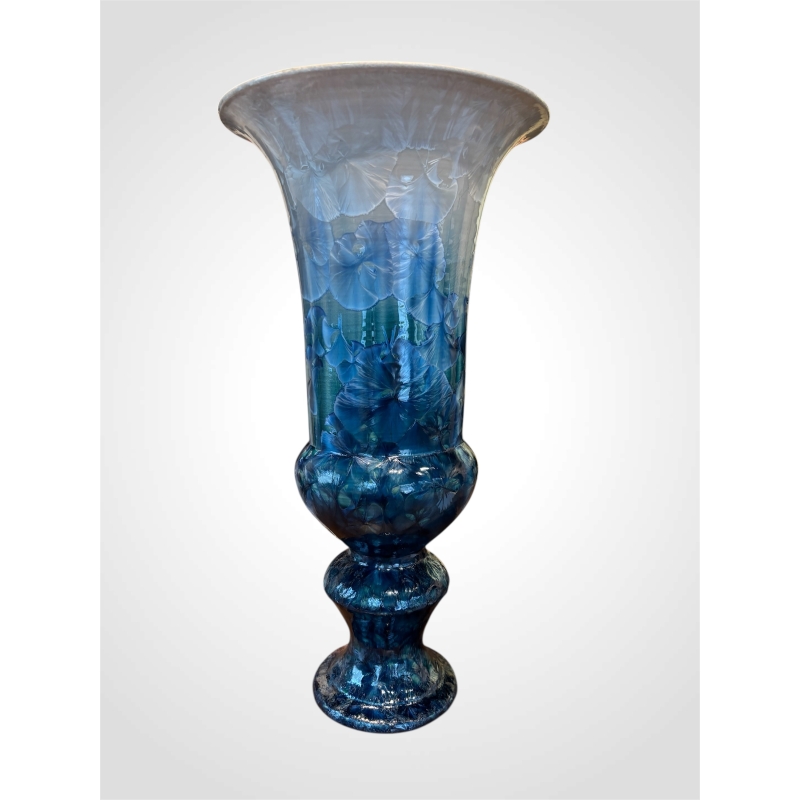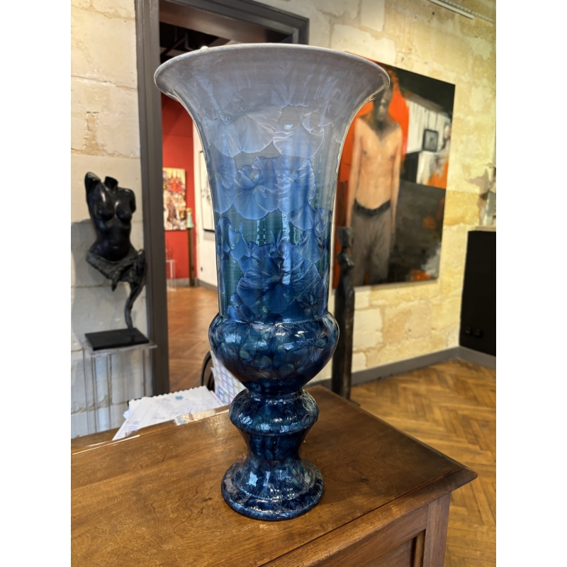 The Médicis Aligned 108 vase, created by Philippe Sutter, belongs to a sculptural exploration where the rigor of a classical form encounters the unpredictable poetry of matter. Inherited from the iconic Médicis model—an archetype of balance and nobility—this crystalline-glazed porcelain vase asserts a strong sculptural presence, carried by a base color of Indian blue, dense, profound, and vibrant.