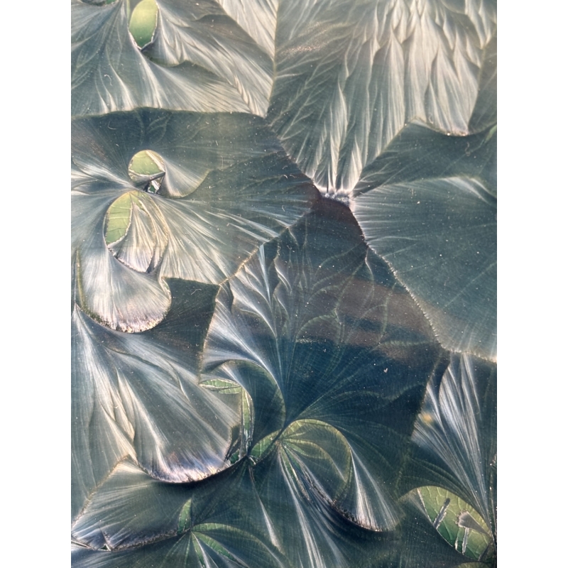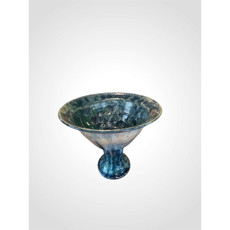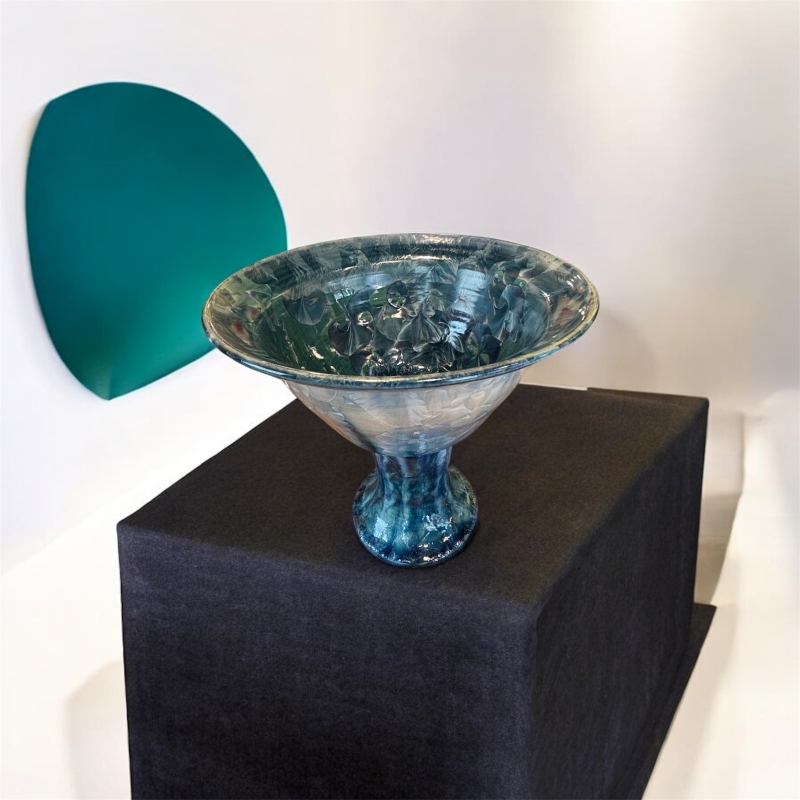 Across the porcelain surface, the crystalline glazes organize themselves into expansive organic formations, evoking wings, petals, or mineral drifts caught mid-expansion. Each crystal appears to radiate from an invisible center, unfolding fine, almost calligraphic veins. These microscopic landscapes are the result of an exceptionally demanding process: high firing temperatures, precisely controlled cooling cycles, and carefully calibrated chemical compositions. Despite this technical rigor, an essential element remains unpredictable. It is within this space of uncertainty that the work’s singularity emerges.
