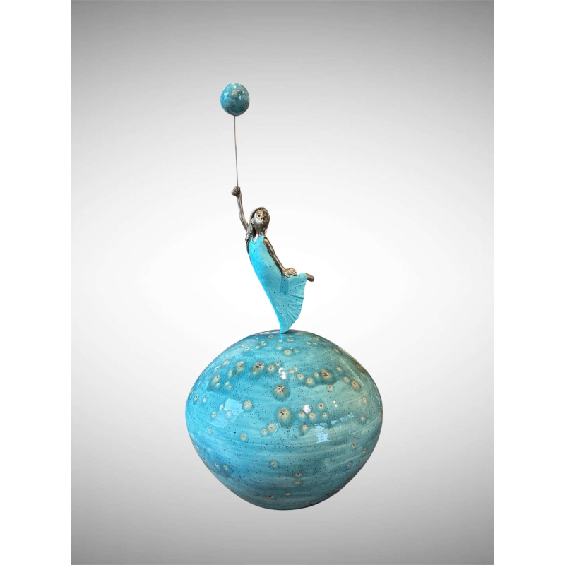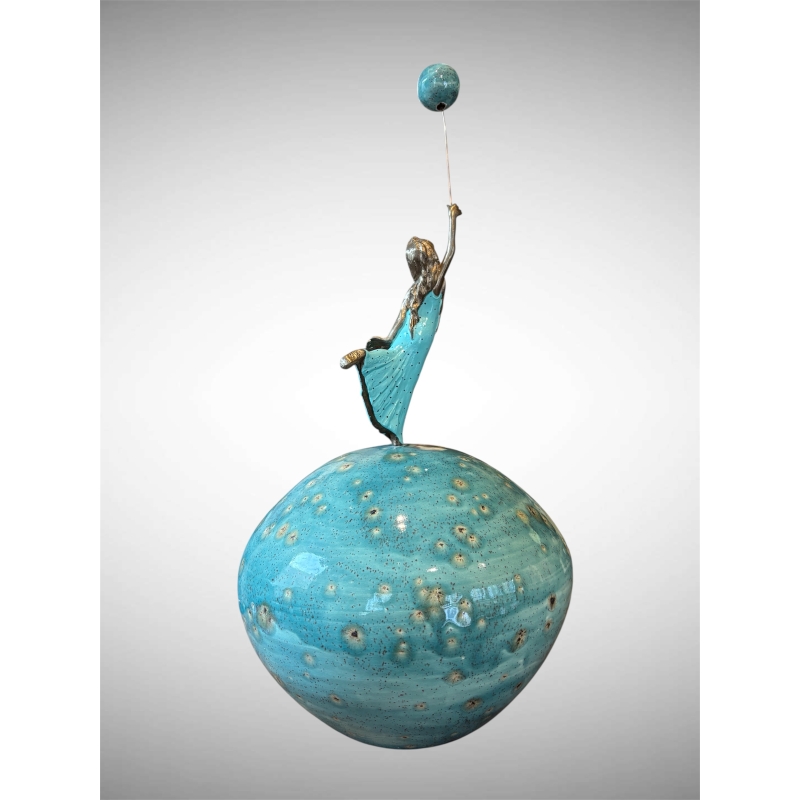 La sphère sur laquelle repose la figure est réalisée en céramique émaillée. Sa surface bleutée, ponctuée de nuances minérales et de petites irisations, évoque une planète miniature ou un monde imaginaire. Les variations de couleurs rappellent les paysages célestes ou marins, donnant à l’ensemble une dimension onirique.