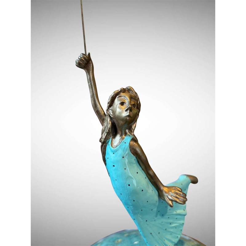 La figure de l’enfant est réalisée en bronze patiné, matériau noble qui confère à la sculpture profondeur et finesse. Les bras élancés, la posture légère et l’expression tournée vers le ballon donnent à la scène une douceur narrative. L’enfant semble prête à s’envoler avec son ballon, portée par la curiosité et l’imaginaire.