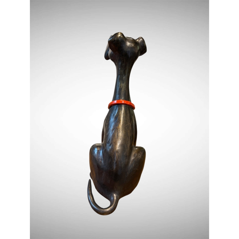 Le collier rouge qui entoure le cou d’Alex apporte une touche de couleur vibrante et contemporaine. Ce détail simple mais marquant renforce la personnalité de la sculpture et introduit un contraste élégant avec la patine sombre du bronze.