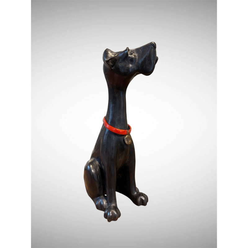 Le visage du chien, légèrement tourné vers le ciel, exprime une émotion presque humaine : la fidélité, la joie ou peut-être l’attente. Cette dimension expressive rend la sculpture particulièrement attachante.