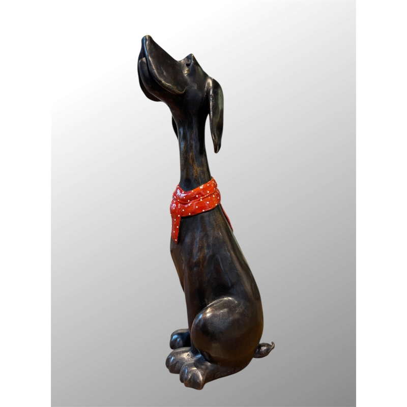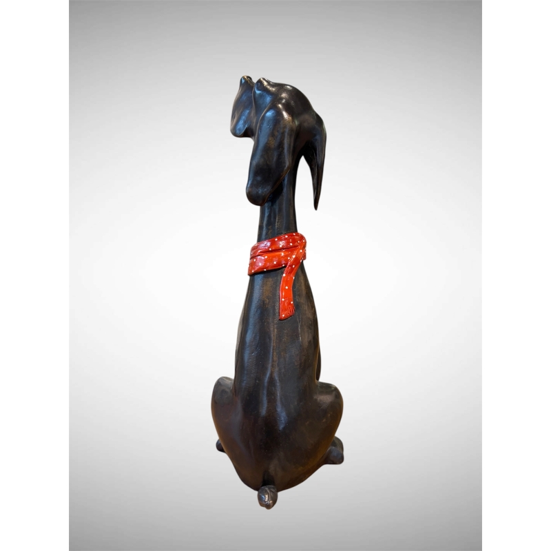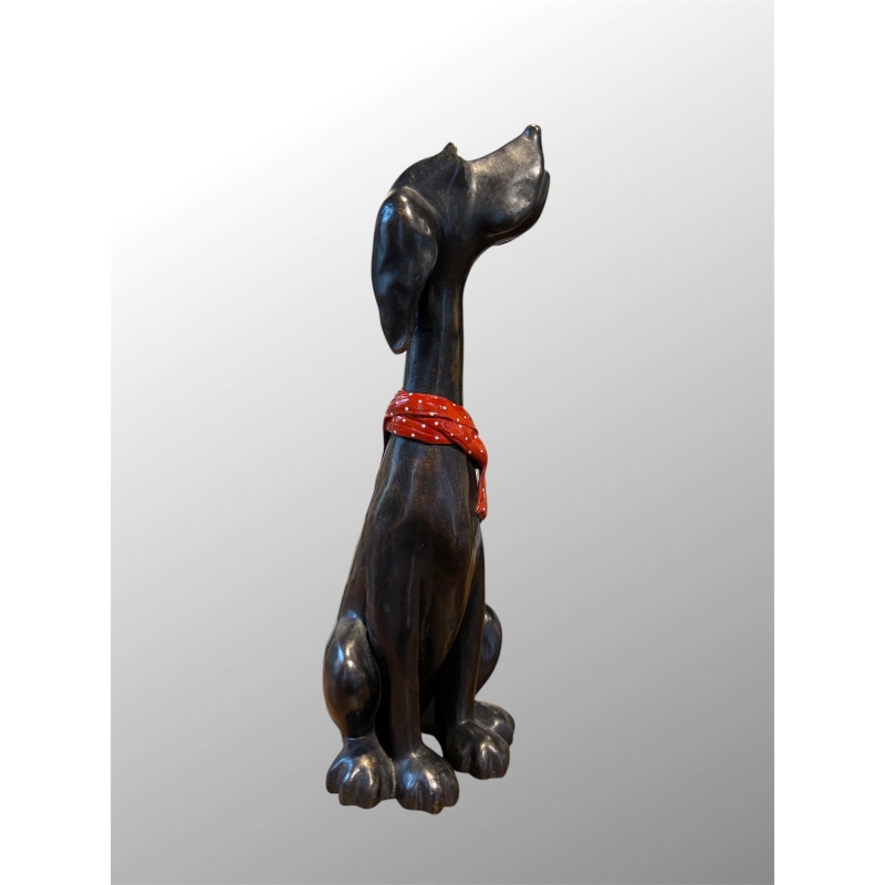 L’un des détails les plus charmants de la sculpture est le foulard rouge à pois blancs noué autour du cou du chien. Cette touche de couleur apporte une dimension contemporaine et ludique à l’ensemble. Le contraste entre la vivacité du rouge et la profondeur du bronze renforce la personnalité de la sculpture.
