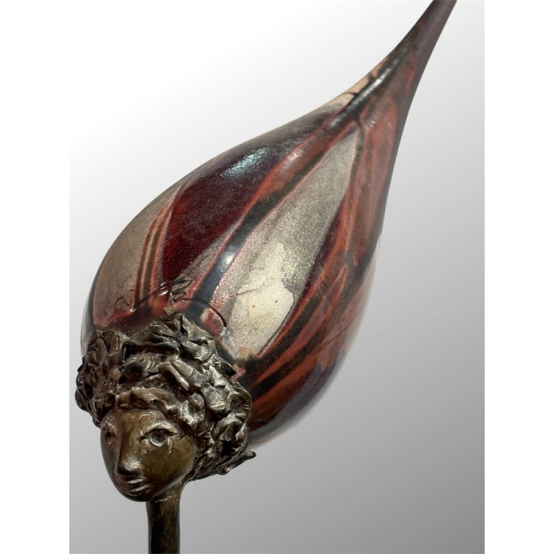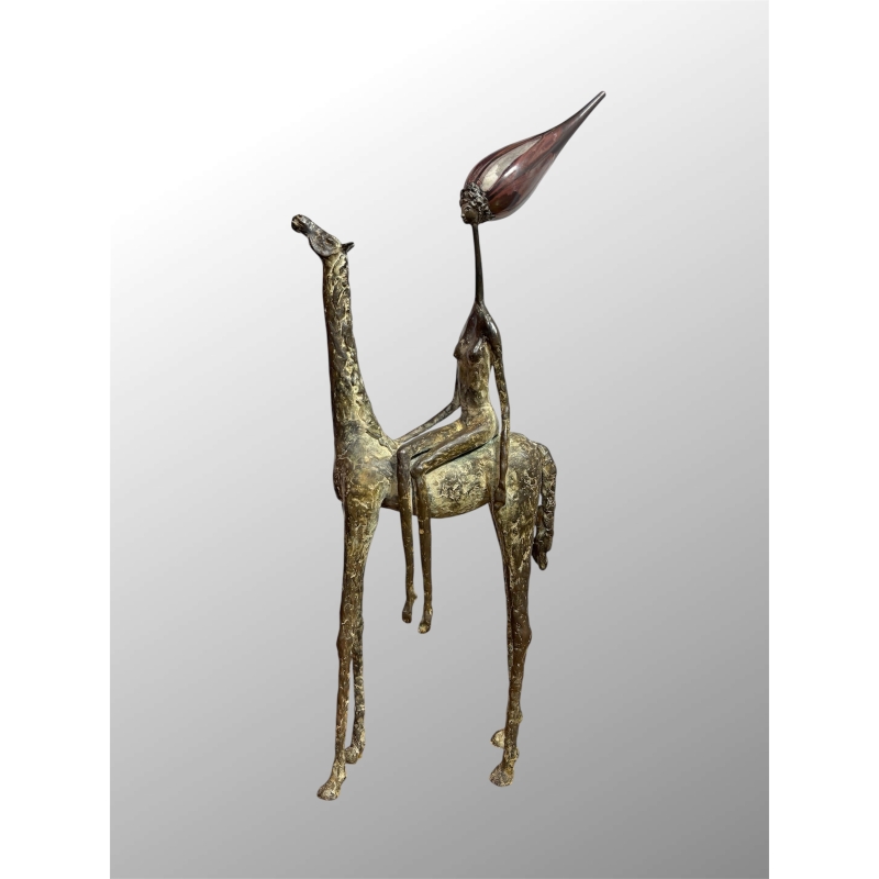 Assise sur le dos du cheval, une figure humaine élancée prolonge cette verticalité. Son corps longiligne, stylisé à l’extrême, rappelle certaines figures de l’art moderne où la simplification des formes révèle l’essentiel. Le cou se prolonge vers une tête de céramique rouge profond, brillante et lisse, qui contraste avec la texture organique du bronze patiné. Cette alliance de matériaux, bronze et céramique, crée une vibration visuelle fascinante : la chaleur sombre du métal dialogue avec l’éclat presque vivant de la terre cuite émaillée.