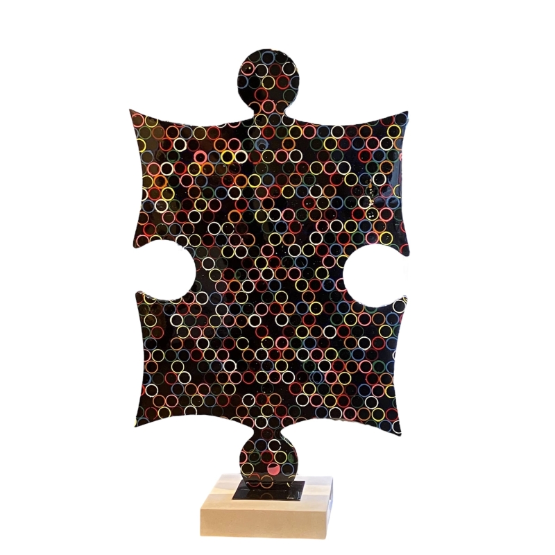 Fabian Delberghe, artiste renommé pour son approche symbolique et son engagement artistique, utilise le puzzle comme métaphore de la société et de l'importance de chaque individu dans celle-ci. Les cercles multicolores, qui s'étendent sur toute la surface de la sculpture, représentent cette diversité qui fait la richesse de la société. Avec "Smile Puzzle", Delberghe nous rappelle que chaque pièce, bien que distincte, est essentielle pour former l’ensemble.