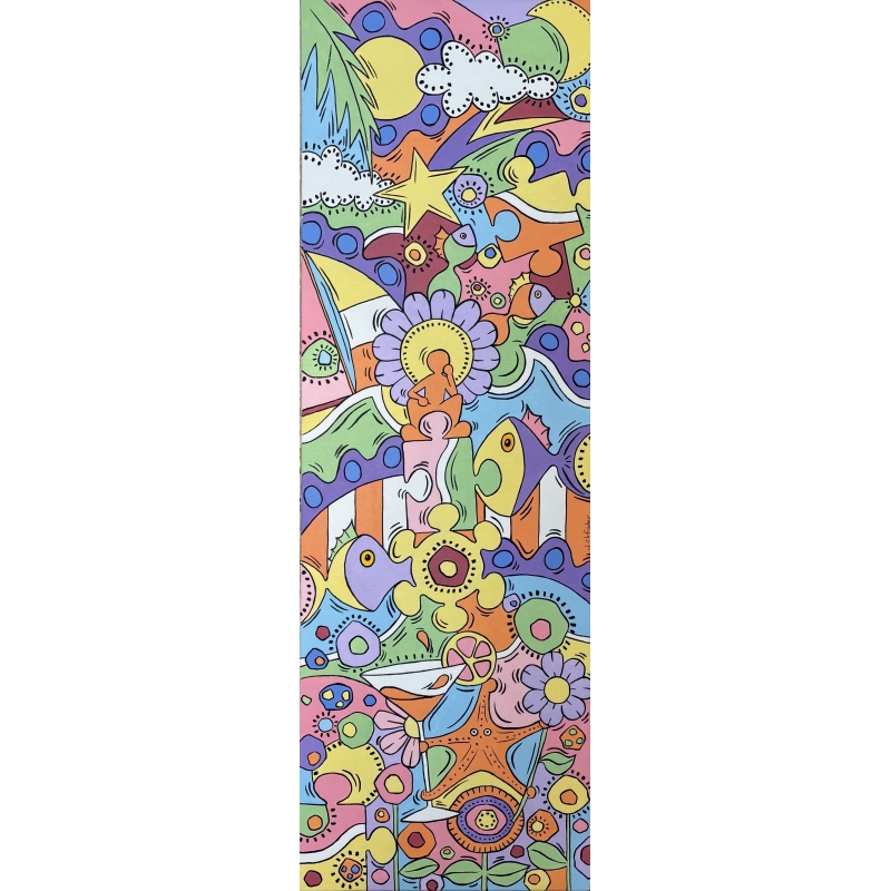 Cette peinture, véritable allégorie de la quête intérieure, invite le spectateur à suivre un chemin d’équilibre, de jeu et de contemplation.