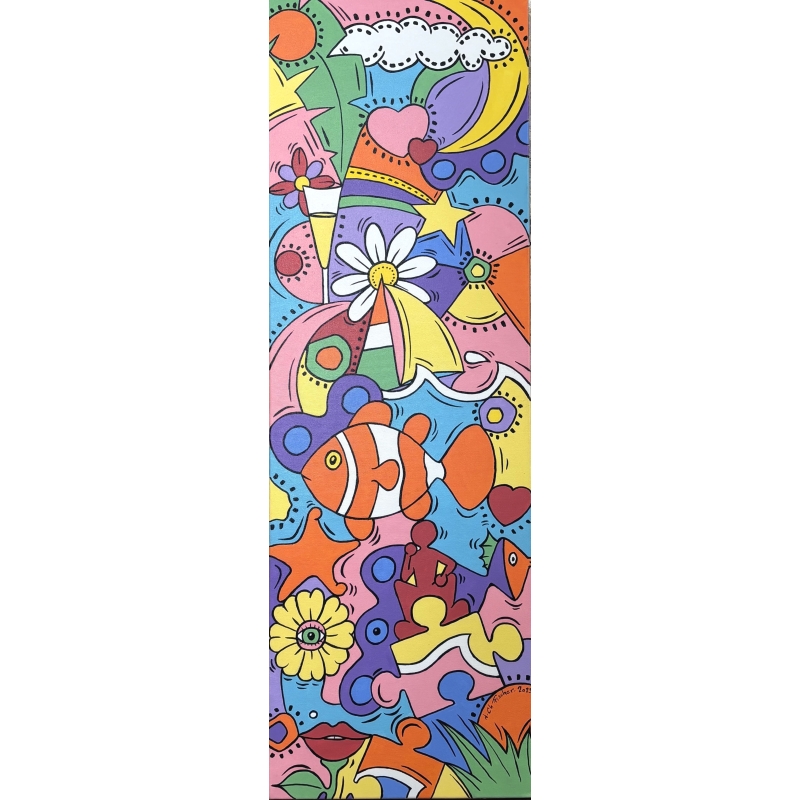 Dans ce format vertical de 90x30 cm, l’artiste déploie un univers foisonnant où la couleur, la forme et le symbole se fondent dans une composition d’une parfaite fluidité. Tout semble circuler, respirer, dialoguer : la peinture devient un organisme vivant, un flux continu d’énergie et de sens.