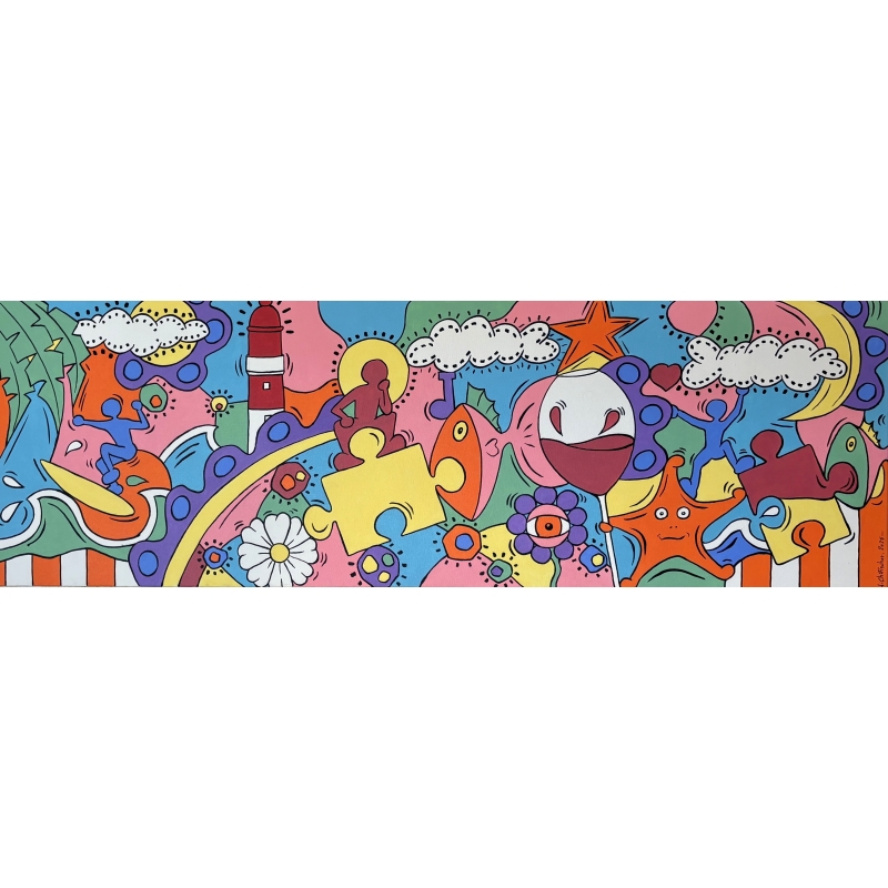 Le phare se dresse comme une présence rassurante, guide symbolique au milieu de cette effervescence. Les personnages, tantôt en mouvement, tantôt méditatifs, incarnent la dualité chère à l’artiste : penser le monde et le vivre pleinement.