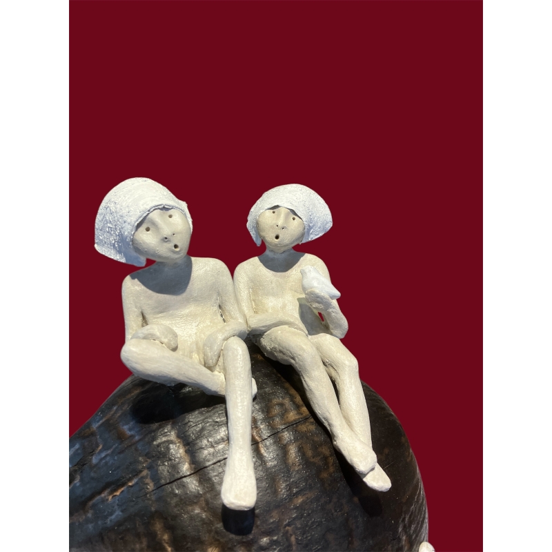 Le choix du support, une noix de coco calcinée, n’est pas anodin. Il renforce l’ancrage de l’œuvre dans la nature et le réel, tout en apportant une texture organique et brûlée qui contraste avec la finesse de la terre cuite. Ce socle sphérique, rond comme un monde ou un fruit défendu, donne à la scène une stabilité tout en évoquant l’idée d’un ailleurs lointain, chaud et enveloppant.