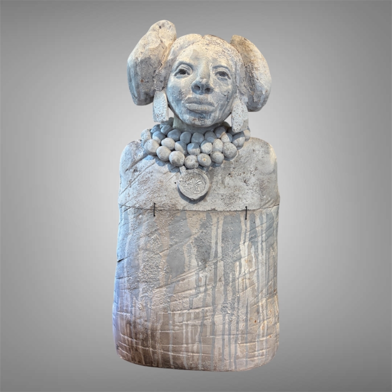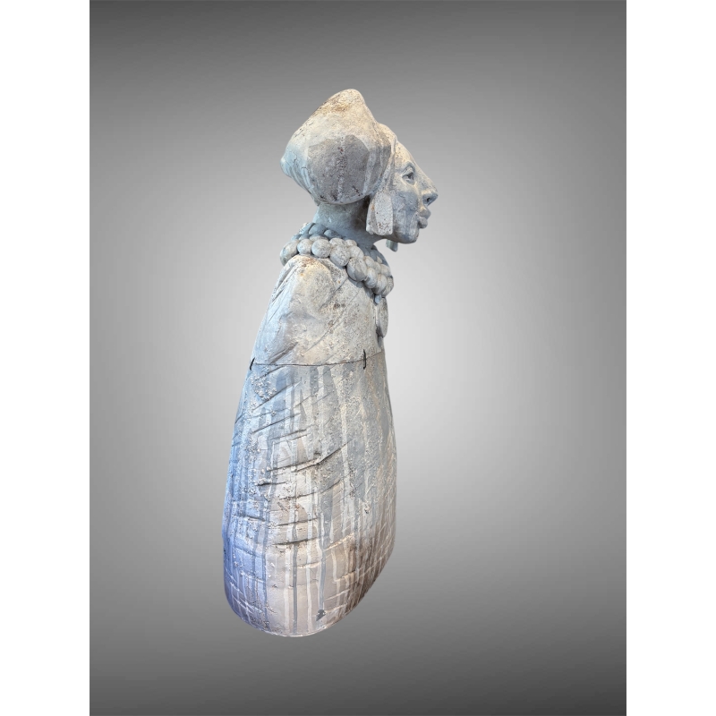 L’ornementation du buste est particulièrement riche : autour du cou, un collier épais constitué de galets de grès forme un arc protecteur. En son centre, un médaillon orné de motifs finement sculptés agit comme un symbole, peut-être un sceau de guérisseuse, peut-être un talisman. Cet élément donne à la figure une dimension sacrée, presque cérémonielle. Les deux grandes boucles d’oreilles rectangulaires, quant à elles, prolongent la verticalité du visage et renforcent l'impression de stature et d’autorité intuitive.