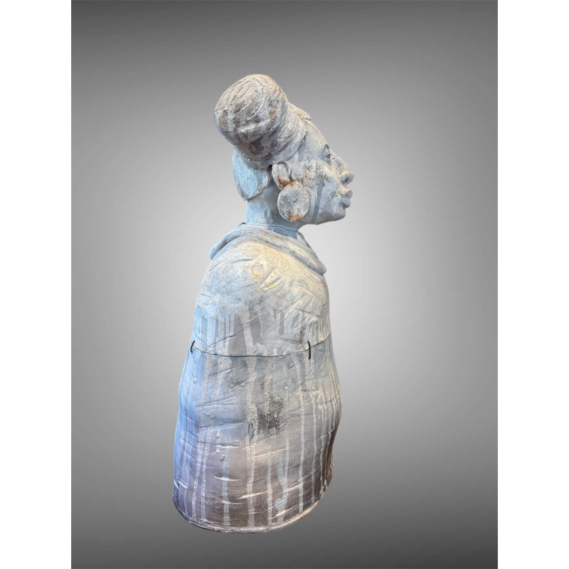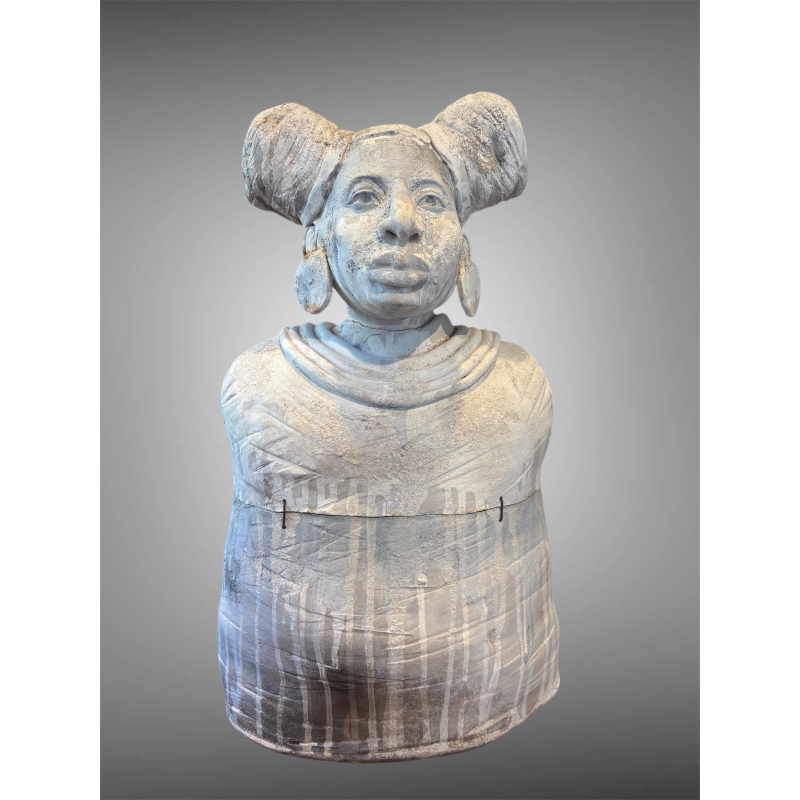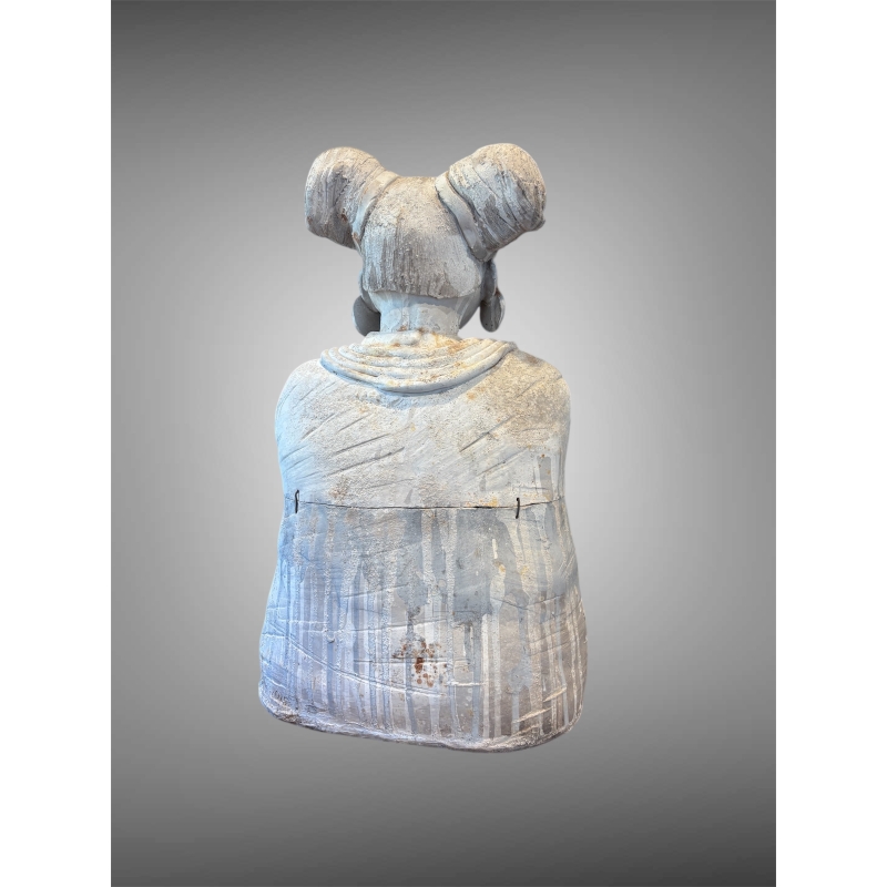 Autour du cou, des anneaux de grès sculptés s’empilent comme des colliers protecteurs. Ils semblent être des parures de statut autant que des signes d’initiation, marquant la figure comme une gardienne du savoir invisible. Le visage, quant à lui, mélange douceur et détermination : les lèvres légèrement pincées, les pommettes hautes et le front tranquille donnent l’impression d’une figure sereine, ancrée, prête à témoigner.