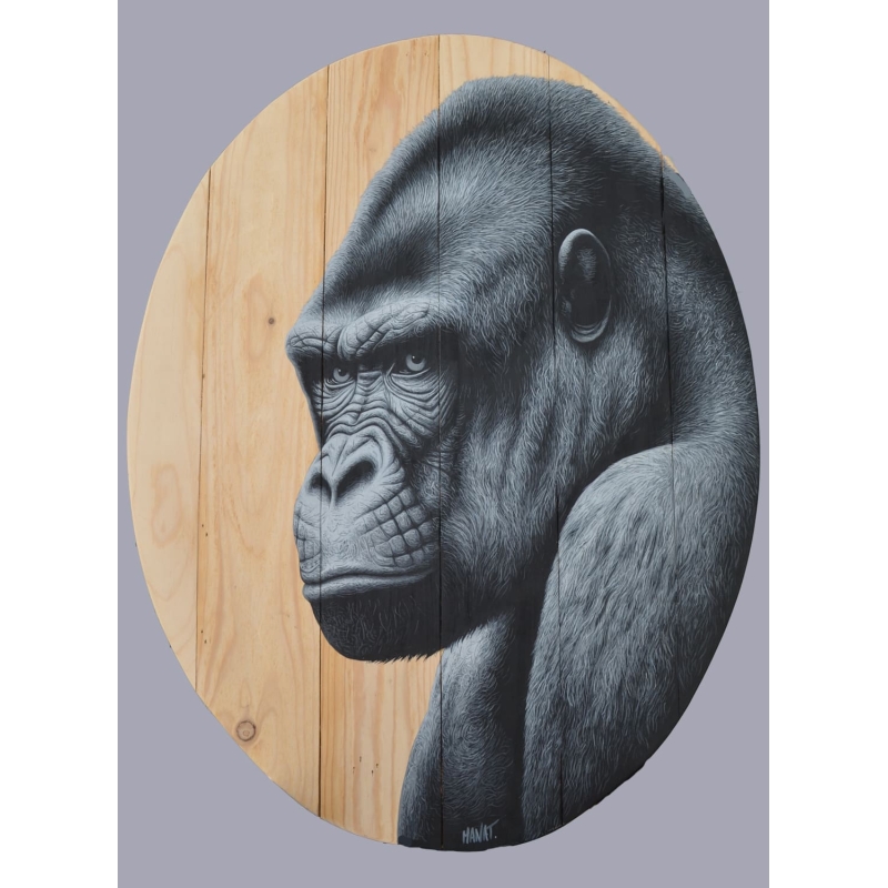 Le choix du support en bois brut, dont les veines naturelles restent visibles, participe pleinement à la narration visuelle. L’artiste ne cherche pas à masquer la matière, mais au contraire à dialoguer avec elle. Le fond chaleureux du bois contraste subtilement avec la palette monochrome du gorille, renforçant ainsi la présence sculpturale de l’animal. Ce contraste crée une tension esthétique entre nature brute et représentation maîtrisée, entre support et sujet.