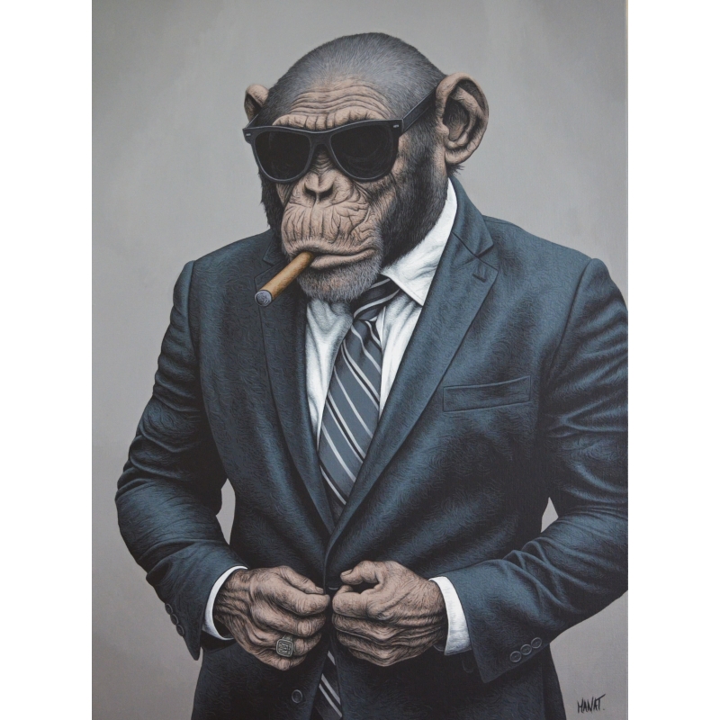 Avec Danylo Kovalenko, l’artiste Manat propose une œuvre à la fois déroutante, élégante et subtilement provocatrice, qui s’inscrit dans une vision contemporaine renouvelée de l’art animalier. Cette peinture acrylique sur toile met en scène un singe anthropomorphe vêtu d’un costume sombre, cravate ajustée, lunettes noires et cigare aux lèvres. Dès le premier regard, l’œuvre intrigue : elle oscille entre réalisme saisissant et satire sociale.