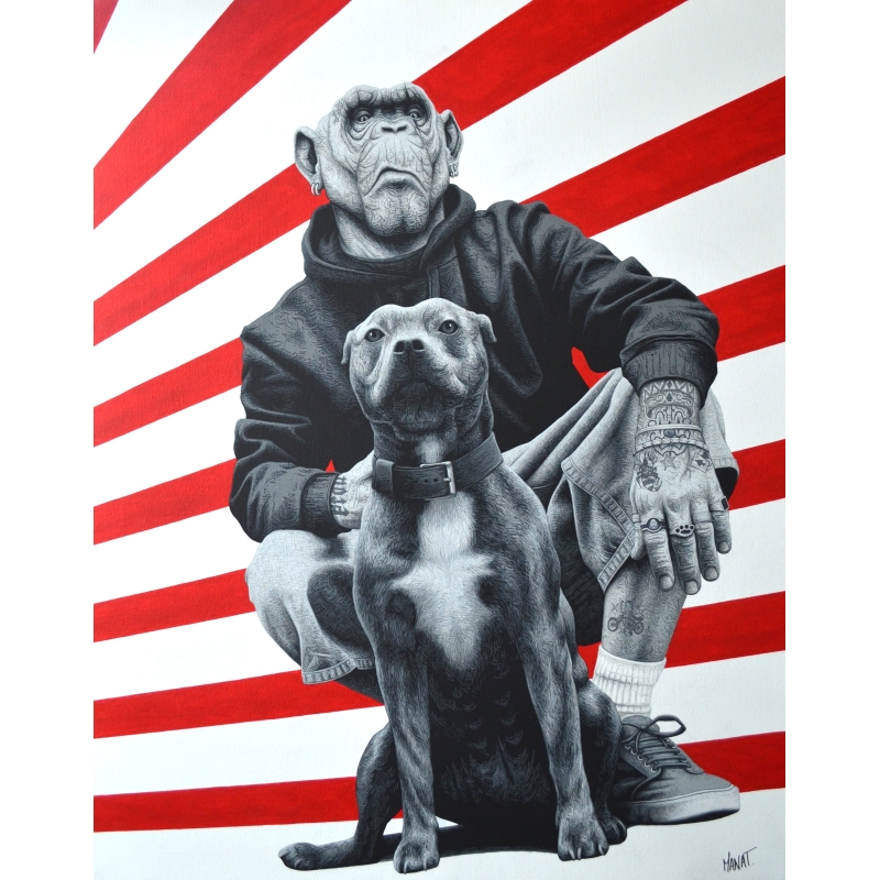 Avec Versil Silver, Manat signe une œuvre puissante et résolument contemporaine, à la croisée du portrait, de l’art animalier et de l’esthétique urbaine. Réalisée avec l’accord de l’artiste Versil Silver, cette peinture acrylique sur toile met en scène une figure singulière accompagnée de son chien, dans une composition à la fois graphique et profondément expressive.