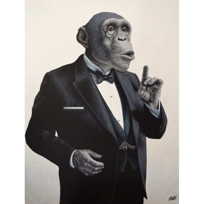 Avec Louis Hobart, Manat poursuit son exploration fascinante du portrait animalier anthropomorphe en proposant une œuvre à la fois élégante, expressive et profondément narrative. Cette peinture acrylique sur toile met en scène un singe vêtu d’un costume formel, dans une posture qui évoque autant l’orateur que le penseur. Le doigt levé, comme suspendu dans un instant de discours ou de révélation, confère à la composition une dynamique singulière.
