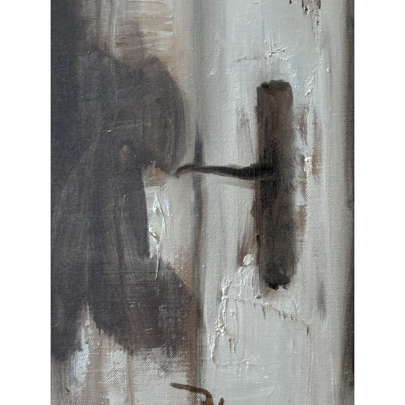 L’arrière-plan, dominé par des bruns profonds et des touches de gris et d’ocre, présente une chaise esquissée, presque fantomatique. Elle n’est pas décrite de manière réaliste, mais plutôt suggérée par des aplats, des traces verticales et des variations de matière. Cette chaise devient un élément à double fonction : elle sert autant de repère spatial que de symbole narratif. Est-elle l’objet d’attente, de repos, de souvenir ? Le spectateur est invité à construire sa propre interprétation.