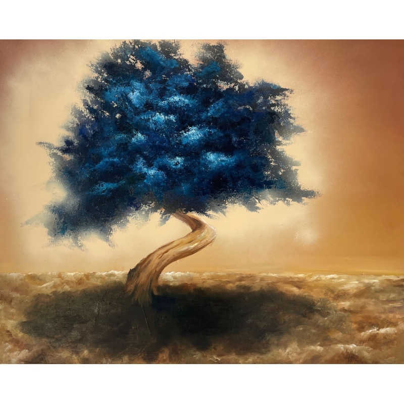 Au centre de la composition, un arbre à la silhouette élancée semble danser doucement sous une lumière dorée. Son tronc, souple et sinueux, s’élève comme un geste, une respiration. Le feuillage, d’un bleu profond, presque saphir, contraste puissamment avec la douceur du fond ocre. Cette opposition chromatique — entre la chaleur du sol et la fraîcheur du ciel — crée une vibration presque spirituelle. Le regard se perd dans les nuances infinies de bleu, où l’on devine la main de l’artiste mêlant transparence et densité, matière et souffle.