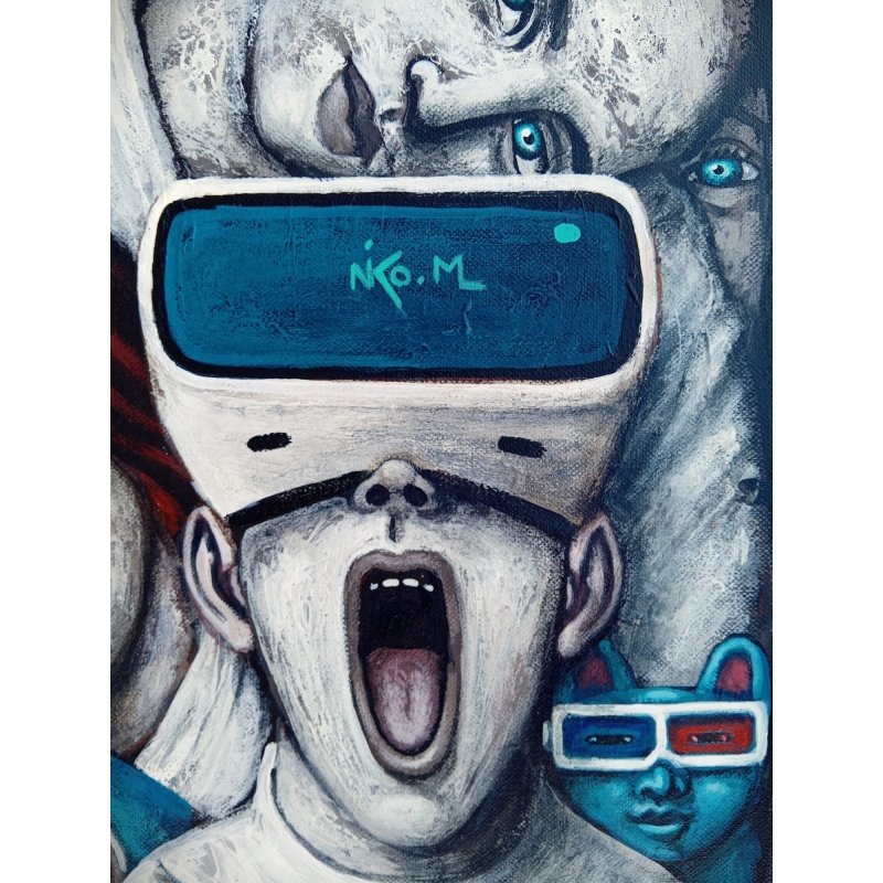 L’arrière-plan regorge de détails : un chien bleu, un personnage au masque de réalité virtuelle, un autre portant des lunettes 3D… Tous ces signes pointent vers une réflexion sur l’aliénation numérique et la fracture entre perception et réalité. Nicolas Monjo dépeint avec humour et gravité notre dépendance à l’image, notre besoin de fuir le réel à travers des écrans ou des illusions de contrôle.