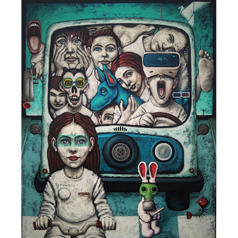 Dans Bleu Trafic, Nicolas Monjo livre une œuvre dense, foisonnante, à la croisée de la peinture narrative et de la satire contemporaine. Réalisée à l’acrylique et à l’huile sur toile, cette composition de 100 x 81 cm s’impose comme un véritable théâtre visuel où l’humain, confiné dans un espace étroit, se débat entre réalité et fiction.