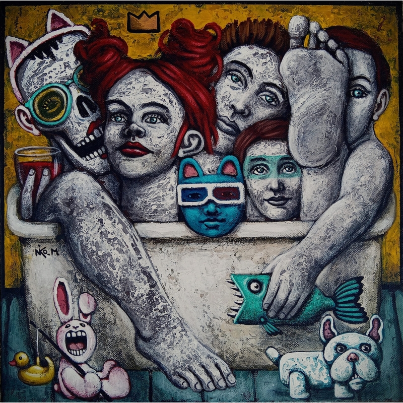Avec Tout corps plongé, Nicolas Monjo signe une œuvre à la fois intime et explosive, où l’humour se mêle à la réflexion, et la satire sociale à la tendresse. Réalisée à l’acrylique et à l’huile sur toile (40 x 40 cm), cette composition compacte et foisonnante explore le thème du corps, de la promiscuité et du jeu des apparences.