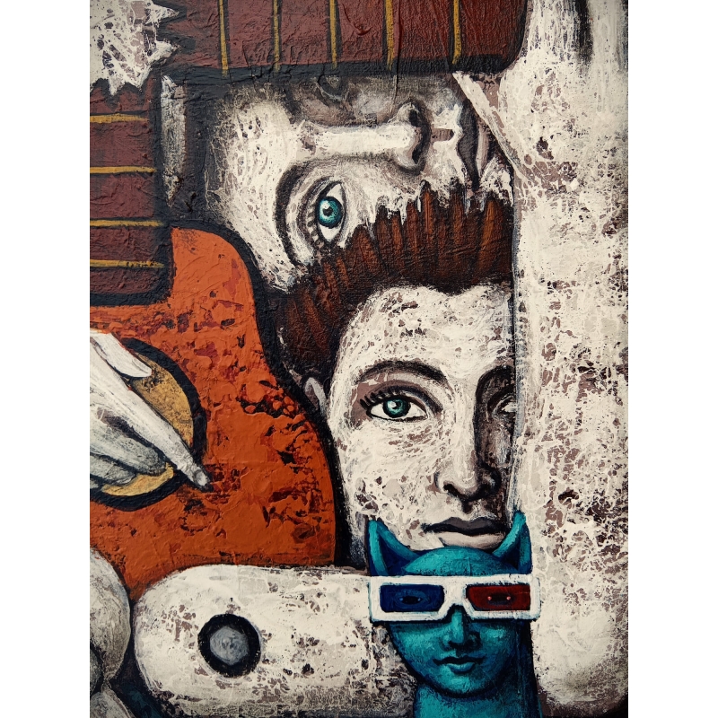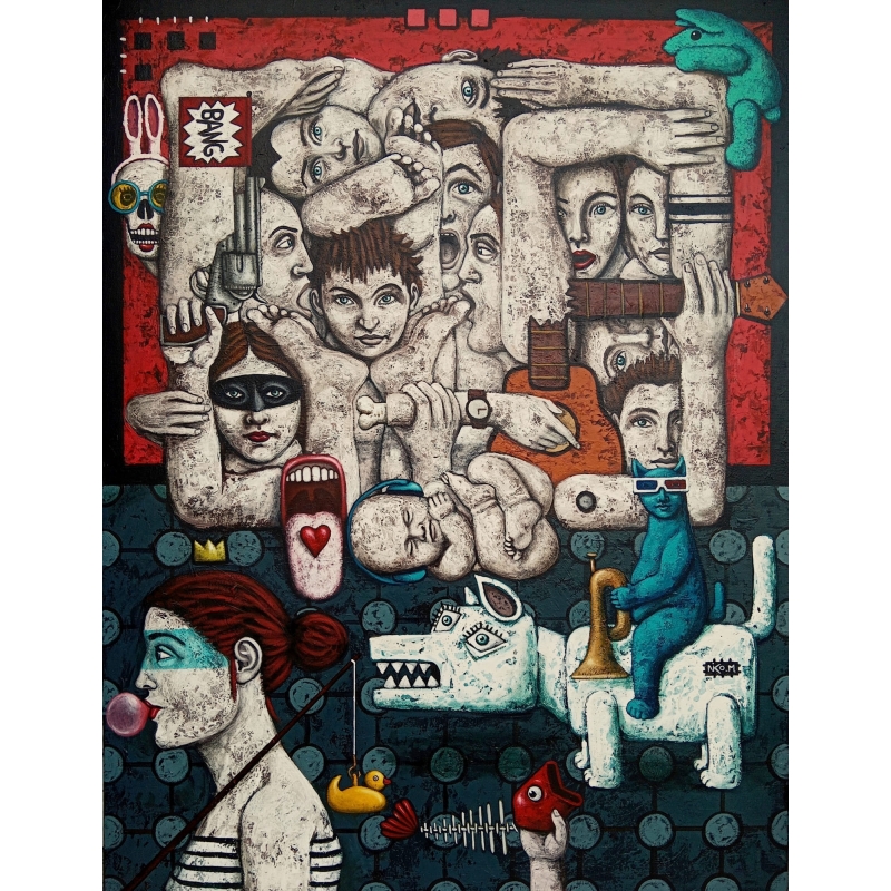 « La Bulle », œuvre réalisée à l’huile et à l’acrylique sur toile par Nicolas Monjo, s’impose comme une scène visuelle aussi dense que critique. Ce tableau grand format (116 x 89 cm) déploie un univers fragmenté, chargé de symboles, de visages, de membres entremêlés et d’éléments absurdes qui, ensemble, composent une narration chaotique et puissamment évocatrice.