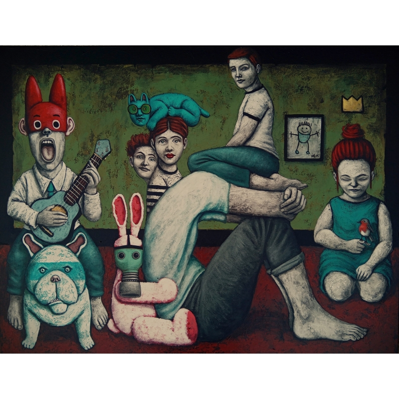 Avec Rouge gorge, Nicolas Monjo déploie une scène à la fois douce et dérangeante, où l’enfance, la mémoire et le symbolique s’entrelacent dans un équilibre fragile. Réalisée à l’acrylique et à l’huile sur toile (89 × 116 cm), cette œuvre s’inscrit dans la continuité de son univers pictural : un espace où la naïveté apparente cache une profondeur émotionnelle et critique.