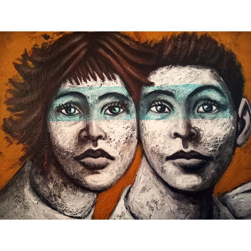 Le cadre est resserré, presque étouffant, mais la posture du couple est solide, apaisée. Monjo peint ici une “place forte” affective, un espace où le lien humain devient refuge. L’équilibre entre matière rugueuse, formes stylisées, couleurs puissantes et regards profonds confère à l’œuvre une intensité qui touche immédiatement.