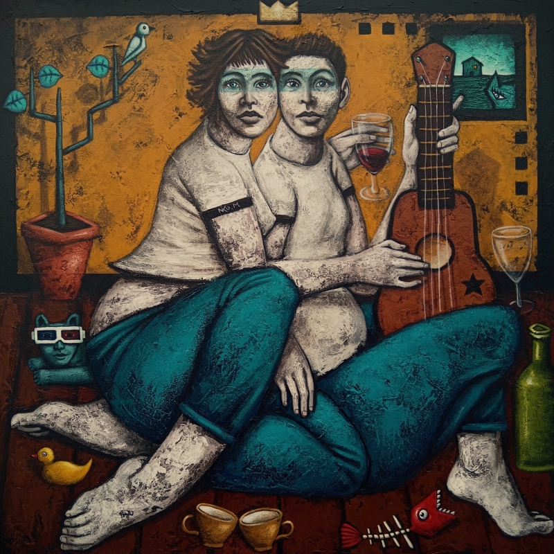 Au centre de la scène, un couple est enlacé, assis au sol, formant un bloc soudé, une forteresse humaine face au chaos extérieur. Leur regard fixe le spectateur, calme, direct, complice. L’un tient une guitare, l’autre un verre de vin. Ensemble, ils semblent dire : "ici, dans cette bulle, nous sommes chez nous, protégés du reste".