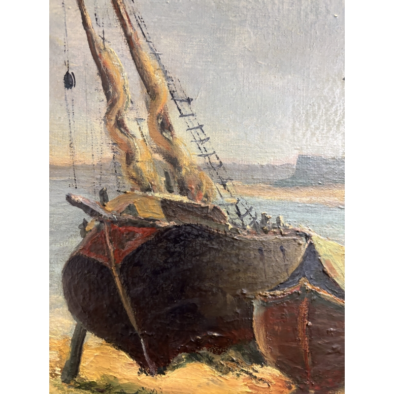 La touche est ample et généreuse, parfois presque empâtée, donnant de la matière aux coques, au sable et au ciel. Cette écriture picturale confère à l’œuvre une forte présence visuelle et un caractère authentique, typique des peintures maritimes du début du XXe siècle.